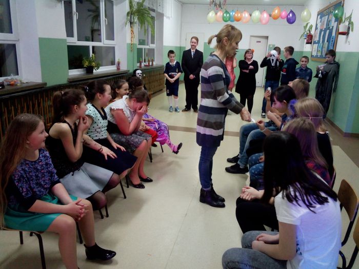 Następnie Samorząd Szkolny pod kierunkiem p. Anny Wnęk i uczniowie klas IV – VI, chcąc uczcić Dzień Edukacji Narodowej, zaprezentowali swój program artystyczny. W sposób humorystyczny w formie skeczy przedstawili dzień z życia szkoły. Była lekcja, odpowiedzi uczniów, przerwy oraz zmagania nauczycieli. Na koniec dzieci złożyły nauczycielom życzenia i obdarowały własnoręcznie przygotowanymi upominkami.