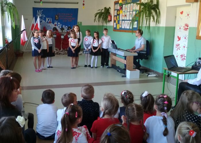 Okazją do uczenia właściwych postaw patriotycznych dzieci i młodzieży szkolnej stał się apel „Kwiecień Miesiącem Pamięci Narodowej” przygotowany przez klasę V pod opieką pani Jolanty Mysza.