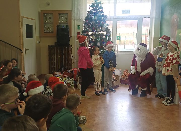 Uczniowie wraz z nauczycielami, dyrekcją oraz pozostałymi pracownikami już w progach szkoły powitali przybyłego gościa radosnym śpiewem znanej piosenki „Bądź pozdrowiony gościu nasz, w radosne progi nasze wejdź …”. Następnie odbyła się cześć artystyczna. Dzieci odśpiewały hymn naszej szkoły, wyrecytowały okolicznościowe wiersze oraz wręczyły ks. biskupowi i towarzyszącym gościom kwiaty. Dyrektor szkoły P. Lycyna Matuszewska jeszcze raz serdecznie witając, przedstawiła historię szkoły, nawiązując do patronalnego imienia, podkreśliła jak ważne i niecodzienne są te odwiedziny dla całej społeczności szkolnej.