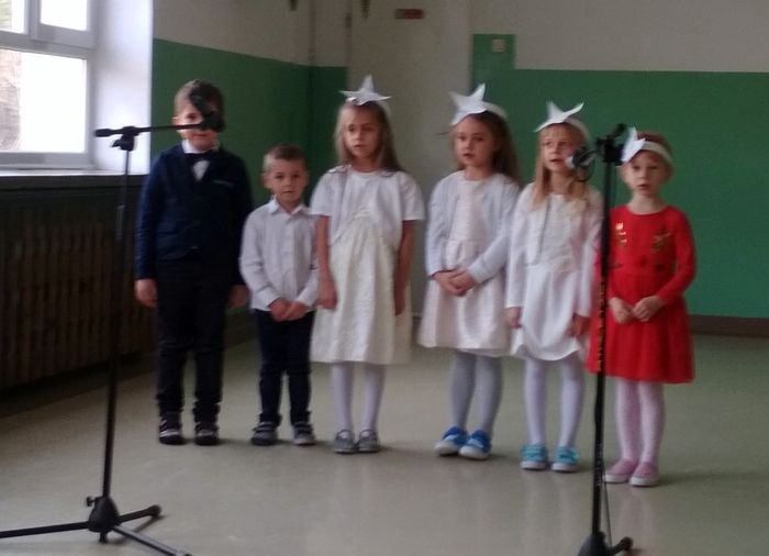 Spotkanie rozpoczęła Pani Dyrektor Lucyna Matuszewska, która pięknymi słowami o nieprzemijającej wartości Świąt Bożego Narodzenia wprowadziła wszystkich zebranych w miły nastrój. Następnie rozpoczęła się część artystyczna. Na scenę wkroczyły przedszkolaki, które z wielkim zaangażowaniem prezentowały swoje role. Później uczniowie z poszczególnych klas pięknie śpiewali kolędy i pastorałki. Kilka utworów zostało zagrane przez uczniów na akordeonie, gitarze, flecie, skrzypcach i keyboardzie.