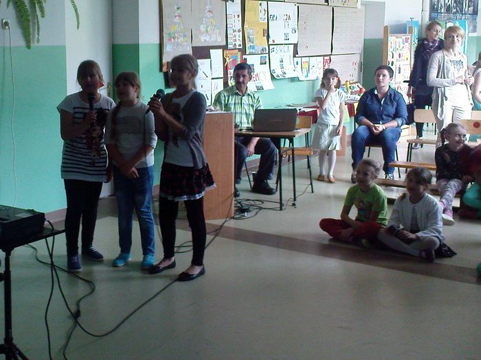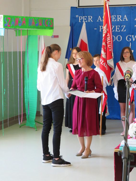 Ale to nie był koniec uroczystości. Nie zabrakło też występu ósmoklasistów, którzy pożegnali się ze swoimi nauczycielami w oryginalny sposób. Dostarczyli wszystkim wyjątkowej rozrywki odgrywając inscenizację popularnego programu „Szansa na sukces”. W lekkiej i przyjaznej formie udało się im zaangażować wszystkich nauczycieli do wspólnego śpiewania ich ulubionych piosenek.