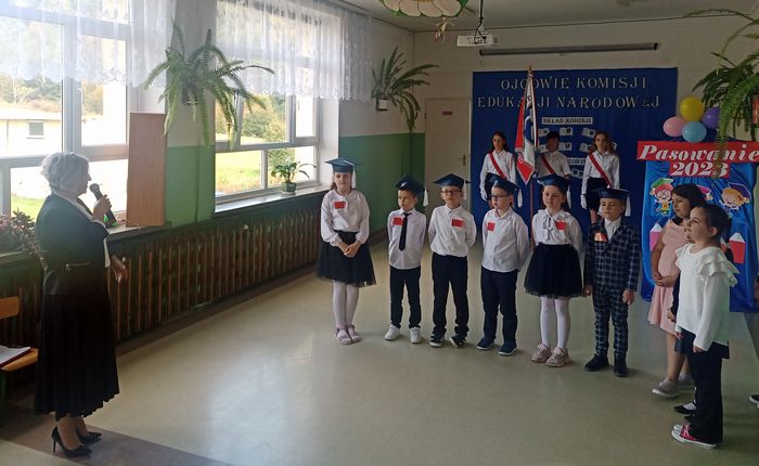 W pierwszej kolejności głos zabrała Pani Dyrektor Agata Wójcicka, która powitała wszystkich zgromadzonych – obecnych i przyszłych uczniów jak również rodziców. Następnie odśpiewaliśmy hymn szkolny oraz przeszliśmy do części oficjalnej. Pani Dyrektor przypomniała, że w tym roku obchodzimy 250. rocznicę powołania Komisji Edukacji Narodowej. Następnie miało miejsce pasowanie pierwszoklasistów na uczniów i maluszków na przedszkolaków. Po tym ważnym dla dzieci i rodziców wydarzeniu „nowi uczniowie” zaprezentowali się w przygotowanych przez siebie występach. Dumne Pierwszaki i Przedszkolaki pod czujnym okiem swoich wychowawczyń – p. Magdaleny Krasulak i p. Joanny Latusek uczestniczyły w inscenizacji, tańczyły, recytowały wierszyki i śpiewały piosenki.