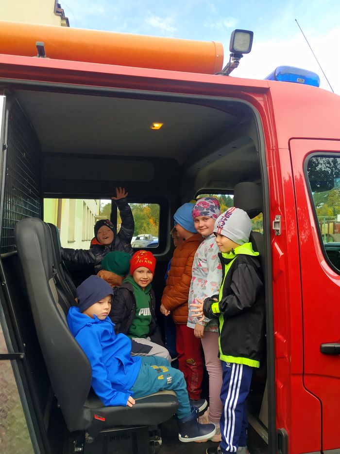 Na koniec spotkania najmłodsi uczniowie mieli okazję obejrzeć z bliska mniejszy wóz strażacki, posiedzieć w środku, a także zapoznać się z wyposażeniem. Strażacy zaprezentowali także różne sygnały alarmowe o ciekawych nazwach, np. sygnał ,,wilk”, sygnał ,,pies”, ,,le-on”.