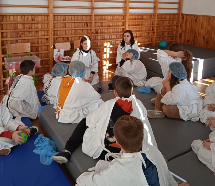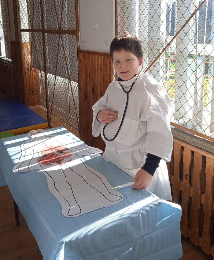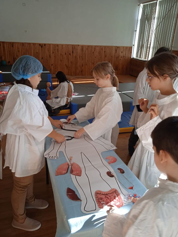 Na początku wszyscy ubrali lekarskie fartuchy oraz czepki. Następnie dzieci z uwagą słuchały o tym, jak zbudowana jest ludzka komórka, narządy, jama ustna czy układ oddechowy. Dowiedziały się, jak długie są ludzkie jelita oraz poznały dokładne położenie serca, żołądka, płuc czy wątroby.