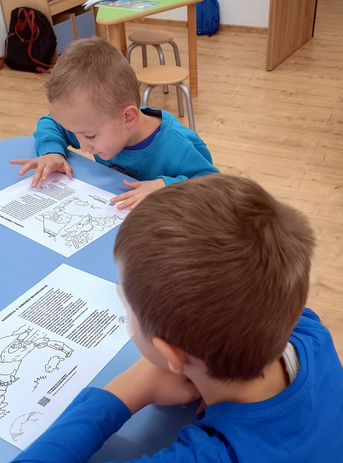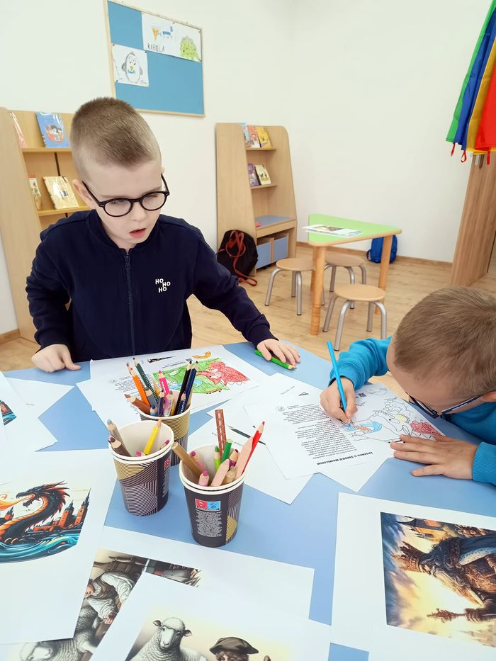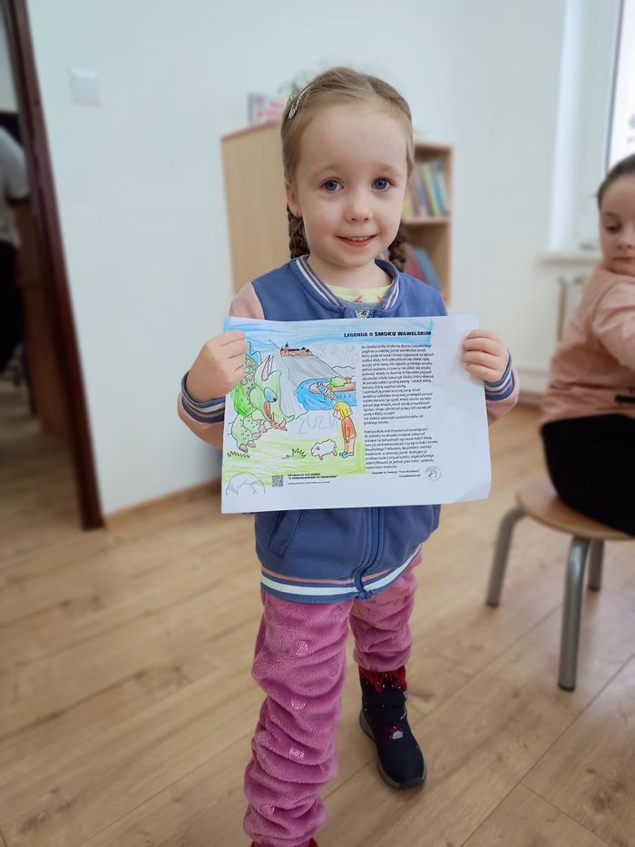 Dzieci wysłuchały „ Legendy o smoku wawelskim”, który straszył mieszkańców grodu Kraka. Poza zapoznaniem się z legendą, dzieci poznawały nazwy postaci występujących w legendzie, w języku angielskim. Po części teoretycznej przyszedł czas na zajęcia plastyczne o tematyce legendy.