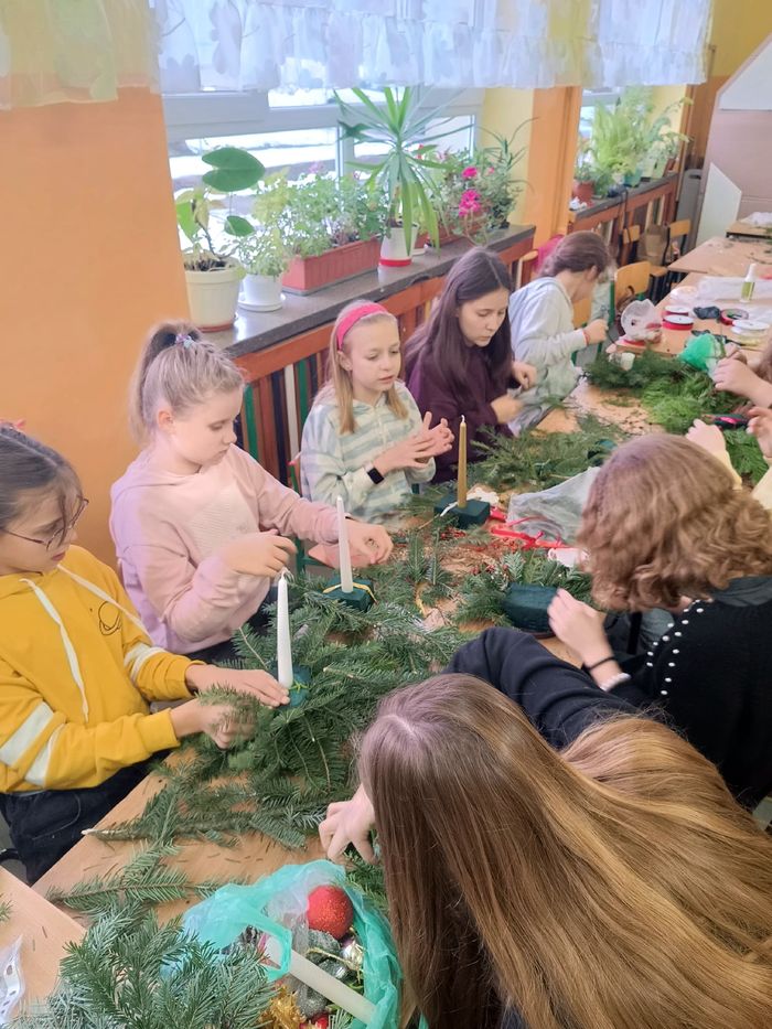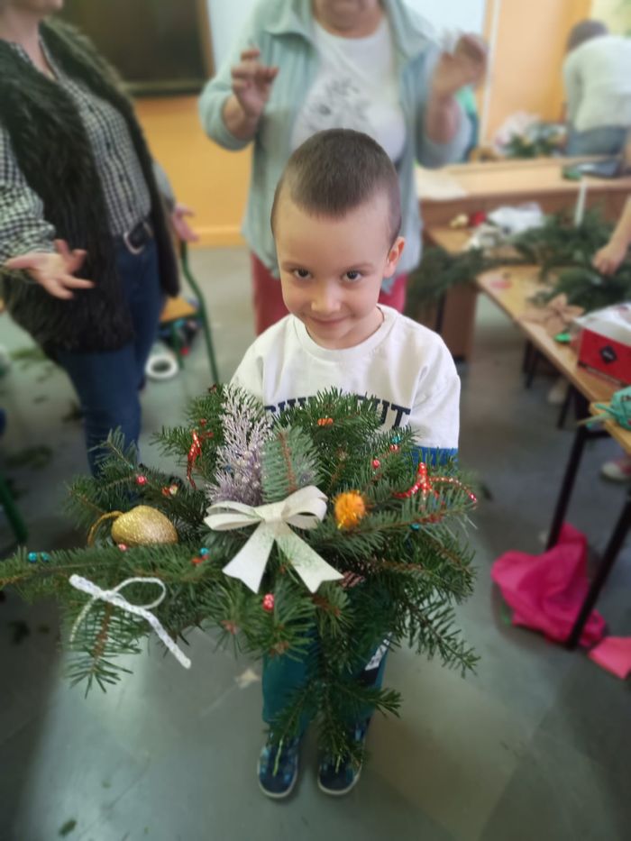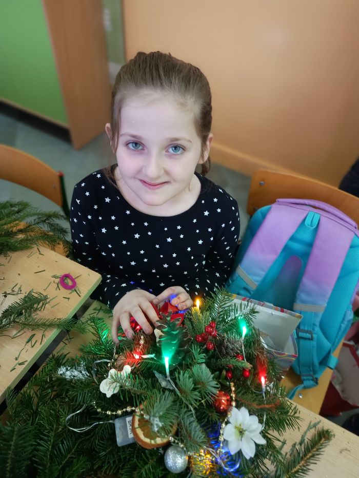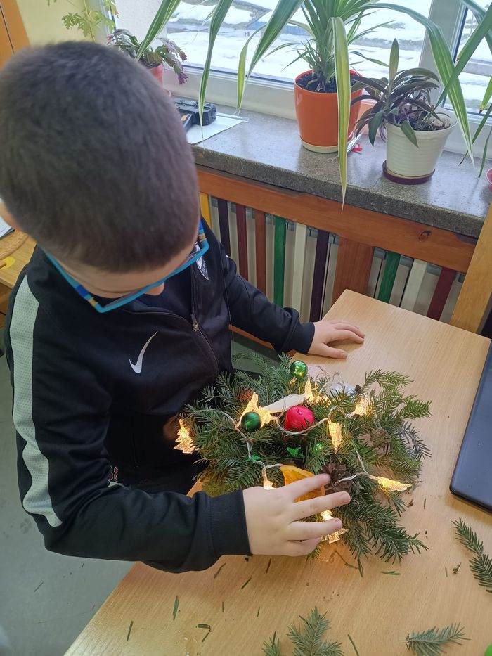 Dzieci pod kierunkiem prowadzącej, wykonały stroiki świąteczne. Wszyscy, ci młodsi jak i starsi wykazali się ogromnym zaangażowaniem. Aktywnie i z uwagą wykonywały polecenia pani Stanisławy. Stroiki wyszły przepięknie, dzieci dumnie prezentowały swoje prace.