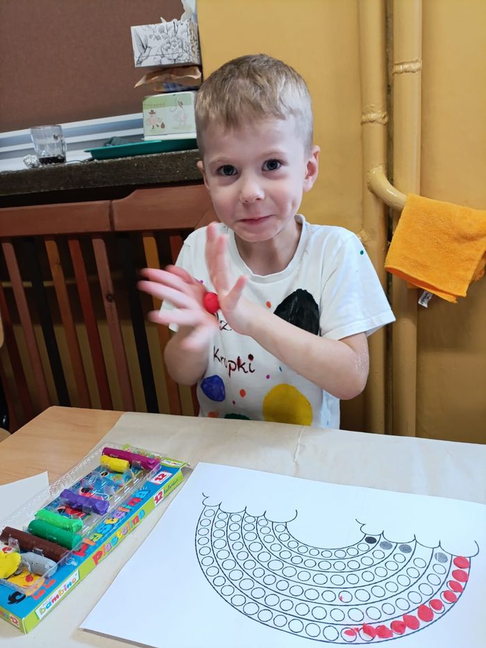 Dzieci poszukiwały także kropek w codziennym życiu, okazało się że jest ich całkiem sporo! Kropki, koła, kulki, często nie wyobrażamy sobie bez nich życia :) Nie brakło także kropkowych zagadek: co powstanie gdy połączymy wszystkie kropki? Dzieci odkrywały różne kształty, np. motyl, samochód, statek, miś kwiatek, itd. Odbyły się także tańce i zabawy przy piosence o kropce. Jako podsumowanie całodniowych działań, na koniec, dzieci wykonały kolorową tęczę z kuleczek plasteliny.