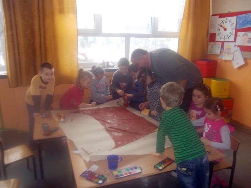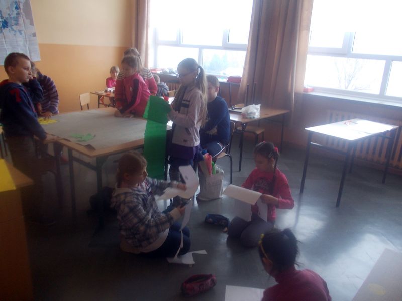 Na tym jednak nie skończyło się poszukiwanie i przywoływanie wiosny. Aby zachęcić ją do przybycia każda klasa postanowiła przygotować (dowolną techniką) wspaniały plakat, będący ilustracją wylosowanego wiosennego przysłowia. Do pracy zmobilizowali się wszyscy. Każdy uczeń chciał, aby dzieło jego klasy było najpiękniejsze.