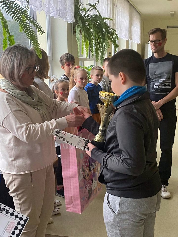 Po zakończeniu turnieju na piątkowym apelu w obecności pani Dyrektor oraz Nauczycieli odbyła się uroczysta ceremonia wręczenia nagród. Mistrz szkoły – Łukasz Grzejszczyk otrzymał puchar oraz dyplom, a wszyscy finaliści zostali uhonorowani upominkami, dyplomami oraz gromkimi brawami. Pani Dyrektor podkreśliła, że gra w szachy pełni ważną rolę w rozwijaniu logicznego myślenia, cierpliwości a także rozwijaniu kompetencji matematycznych.