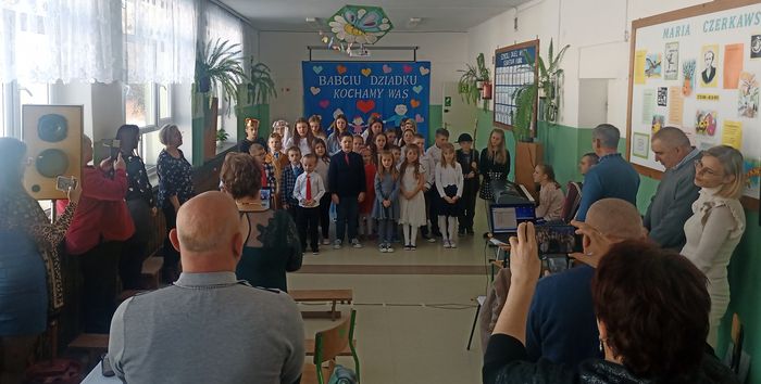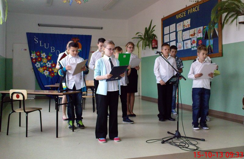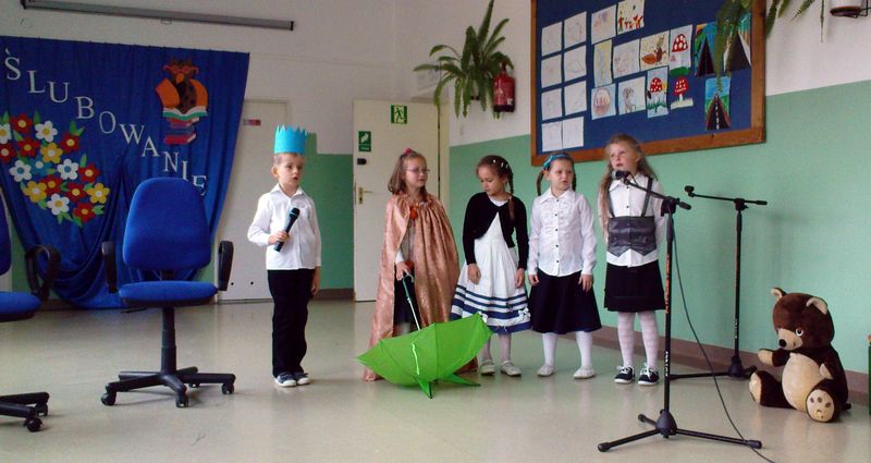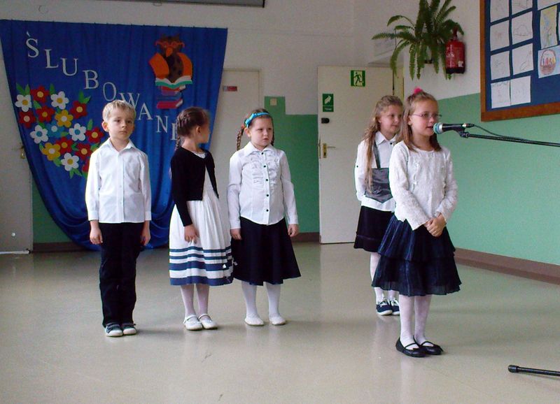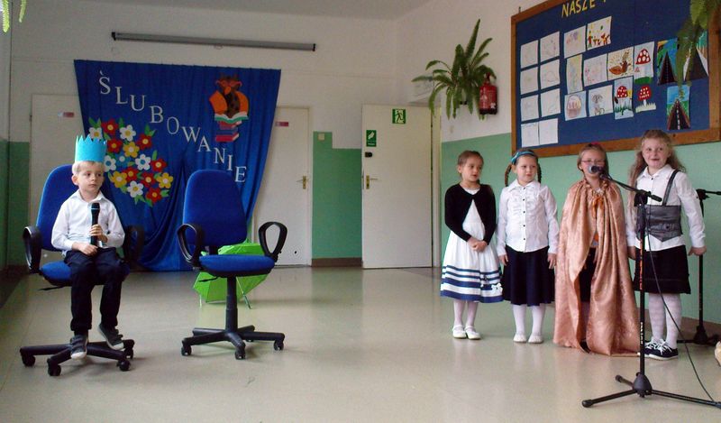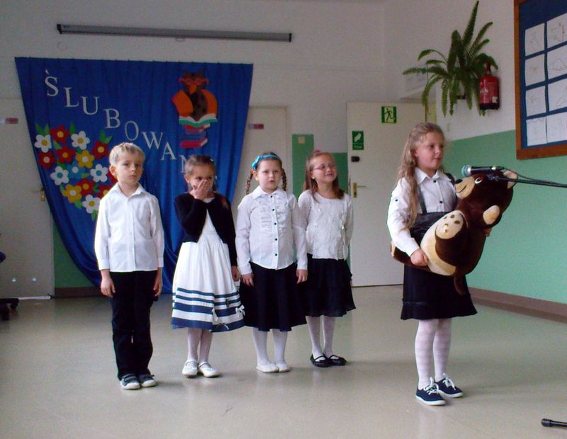 Po części oficjalnej rozpoczęła się część artystyczna. Dzieci z klasy IV pięknie przywitały pierwszaków recytując wiersze, a Pierwszoklasiści wspierani przez wychowawczynię Zofię Biskup zaprezentowali swoje zdolności wokalne i recytatorskie.