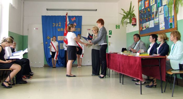 Po uroczystych przemówieniach i wyprowadzeniu sztandaru szkoły, Pani Dyrektor wręczyła świadectwa z wyróżnieniem oraz nagrody za bardzo dobre wyniki w nauce, wzorowe zachowanie i inne sukcesy, a także listy gratulacyjne rodzicom wyróżnionych uczniów.