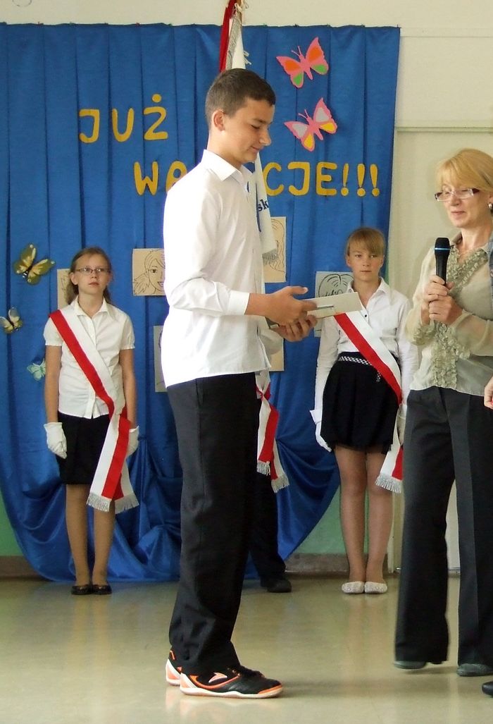 Na koniec wystąpili chłopcy z klasy piątej żegnając absolwentów. Życzyli swoim starszym kolegom i koleżankom wszystkiego najlepszego w nowej szkole, samych sukcesów i powodzenia w każdej dziedzinie. Na pamiątkę wręczyli im drobne upominki i „bilety” do Gimnazjum z cennymi radami.