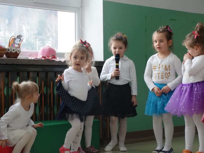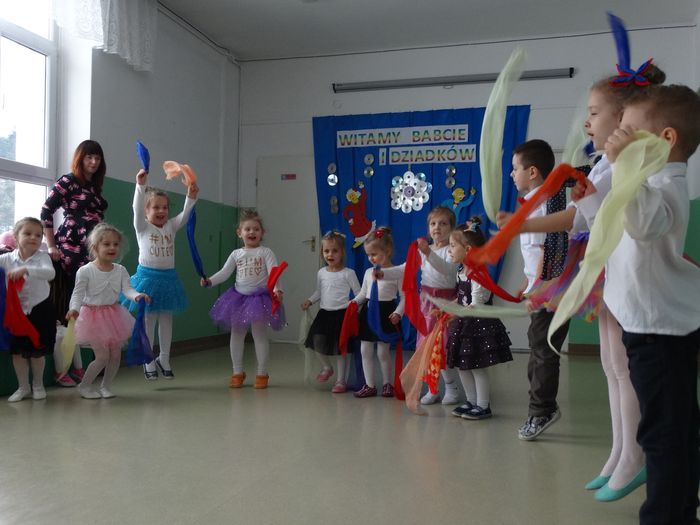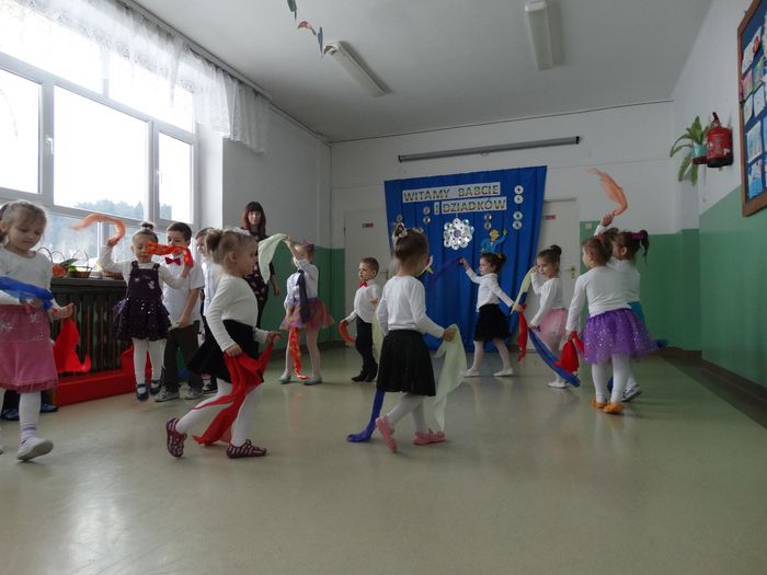 Przedszkolaczki zaprezentowały piosenkę pt.: „Poleczka dla babci i dziadka”, w formie wierszy złożyły dziadkom i babciom życzenia, po czym wystąpiły w dwóch tańcach. Pierwszy – „Taniec dla krasnoludków” – z wykorzystaniem chustek. W drugim tańcu uczestniczyły same dziewczynki przystrojone w piękne, kolorowe boa wykonane z bibuły i piórek. Zaprezentowały taniec do piosenki „Nogi”.
