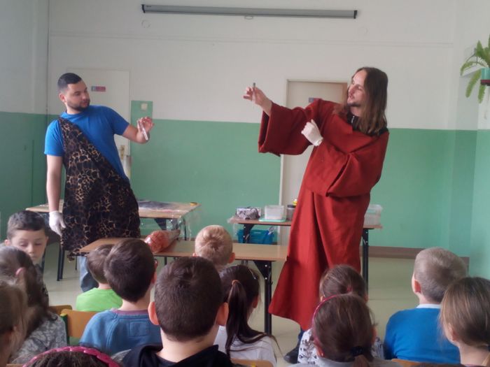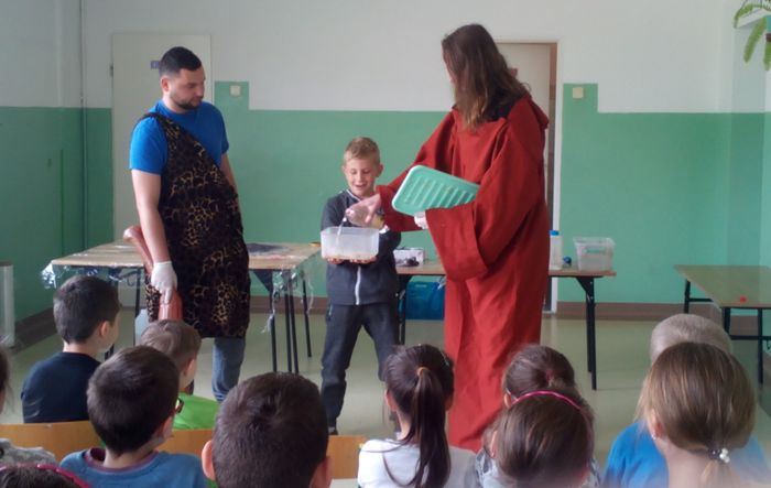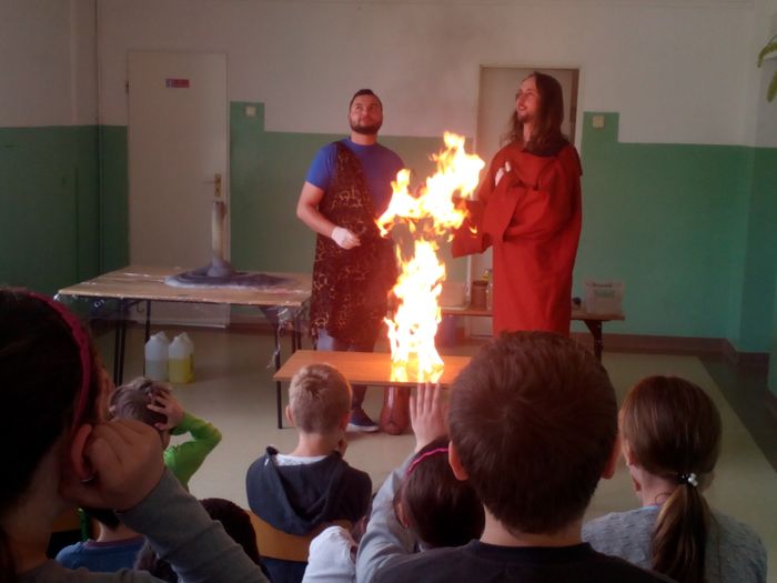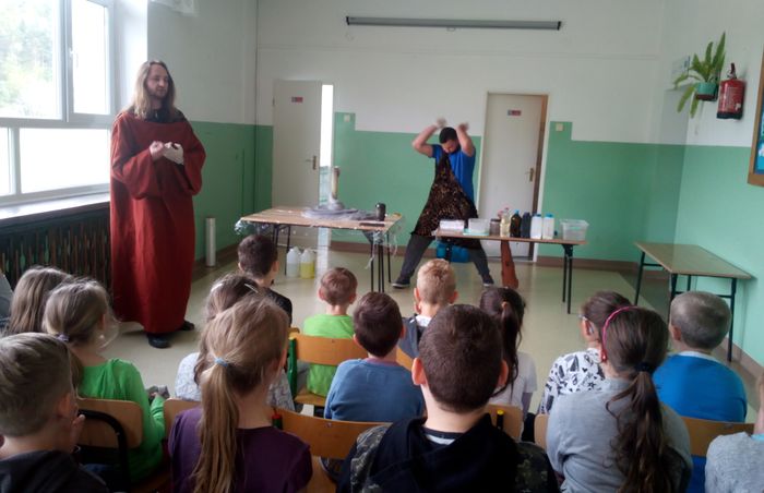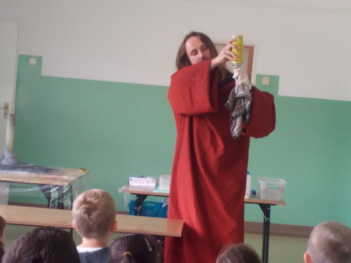 Czy to magia? Nie! To czysta nauka. 10 maja do naszej szkoły przyjechała grupa animatorów „Zaelektryzowani”. W sposób bardzo ciekawy, widowiskowy, a jednocześnie wesoły i zabawny animatorzy prezentowali niezwykłe eksperymenty fizyczno -chemiczne oraz interesujące ciekawostki o budowie organizmu ludzkiego. W ramach spektaklu uczniowie obserwowali proste eksperymenty związane z naukami przyrodniczymi i dowiedzieli się m.in. na czym polegają doświadczenia związane z CO2, gwałtowny samozapłon siedmiotlenku manganu i tworzenie szalonej piany zwanej inaczej słoniową pastą do zębów złożonej z płynu do mycia naczyń, jodku potasu i wody utlenionej. Najciekawszym elementem spektaklu była możliwość aktywnego uczestnictwa dzieci w pokazie co zachwyciło uczniów. Żywa lekcja przyrody okraszona ogromną dawką humoru bardzo podobała się wszystkim widzom. Aktorzy nie tylko wspaniale bawili publiczność, ale także rozbudzili wśród uczniów zainteresowanie wiedzą z zakresu przyrody.