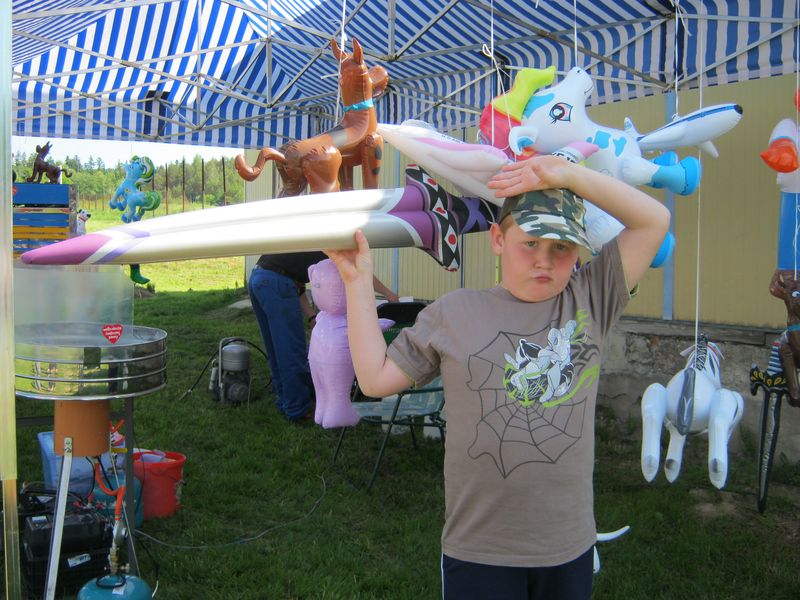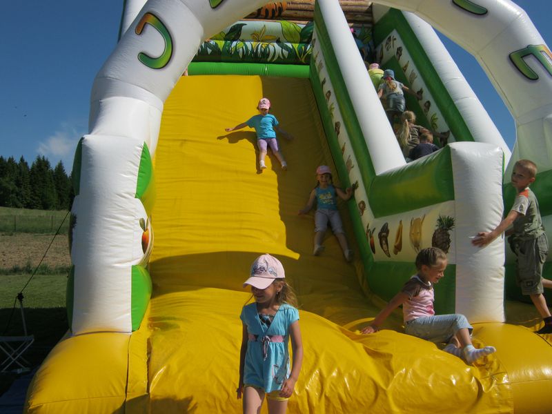 Następnie udaliśmy się na boisko, gdzie nauczyciele wraz z rodzicami przygotowali wiele atrakcji. Dzieci mogły wykazać się w różnych konkurencjach sportowych, m.in. w grze w siatkówkę, skokach w workach czy przeciąganiu liny. Można było również pozjeżdżać na pompowanej zjeżdżalni albo poskakać na trampolinie. Nie mogło zabraknąć także popcornu, waty cukrowej i balonów, które były sprzedawane za niewielką cenę.