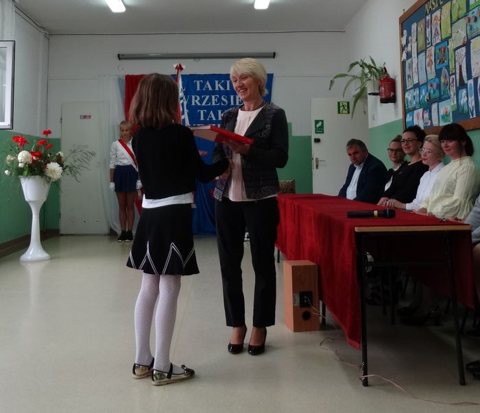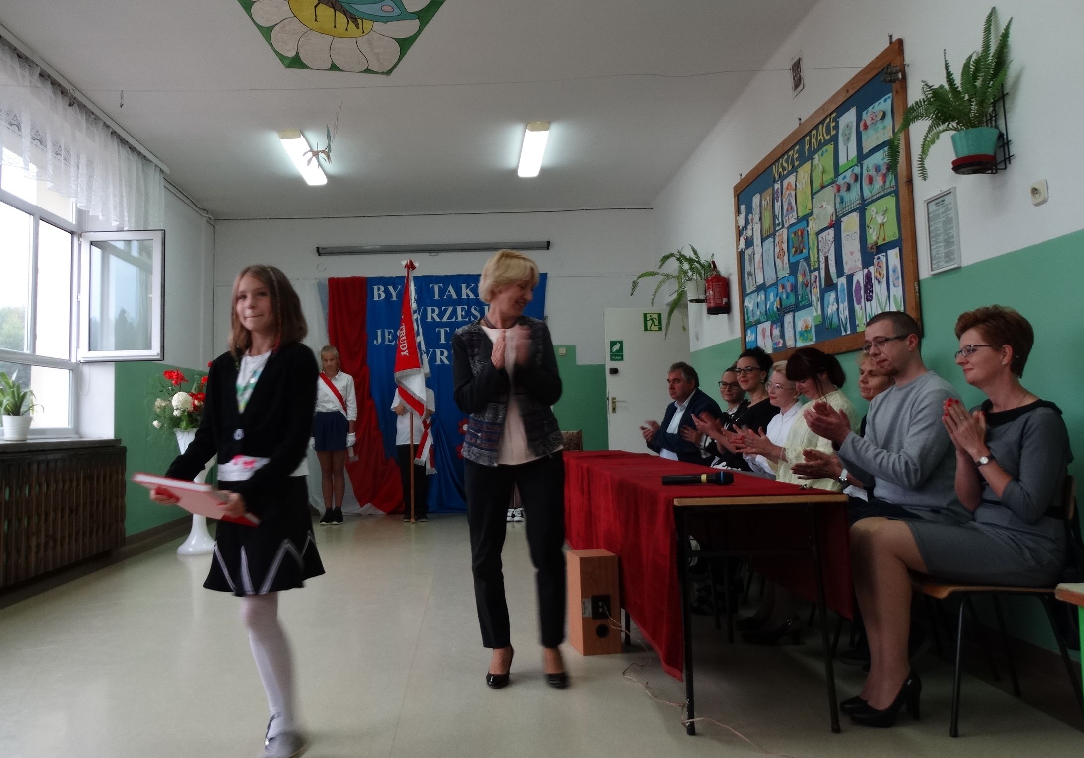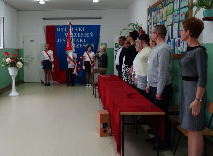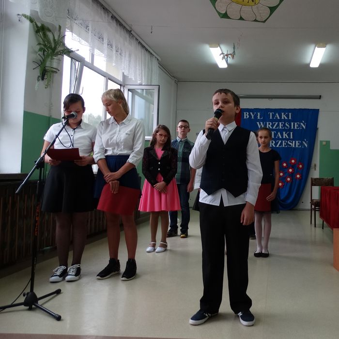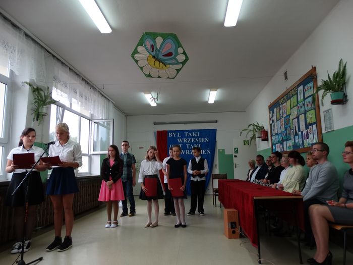 Po mszy świętej, wszyscy udali się do szkoły, gdzie Pani Dyrektor Lucyna Matuszewska przywitała serdecznie przybyłych uczniów, rodziców i całe grono pedagogiczne, przedstawiła nowo zatrudnionych nauczycieli, wychowawców klas i zaprosiła na część artystyczną, upamiętniającą 78. rocznicę wybuchu II wojny światowej, przygotowaną przez uczniów z klas IV, V, VI i VII pod przewodnictwem Pani mgr Anny Wnęk. Występujący recytowali wiersze przy akompaniamencie muzyki takich kompozytorów jak m.in. Robert Schumann i Ludwig Van Beethoven („Marzenie”, „Sonata Księżycowa”) oraz muzyka Krzysztofa Klenczona (Biały Krzyż).