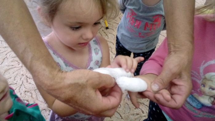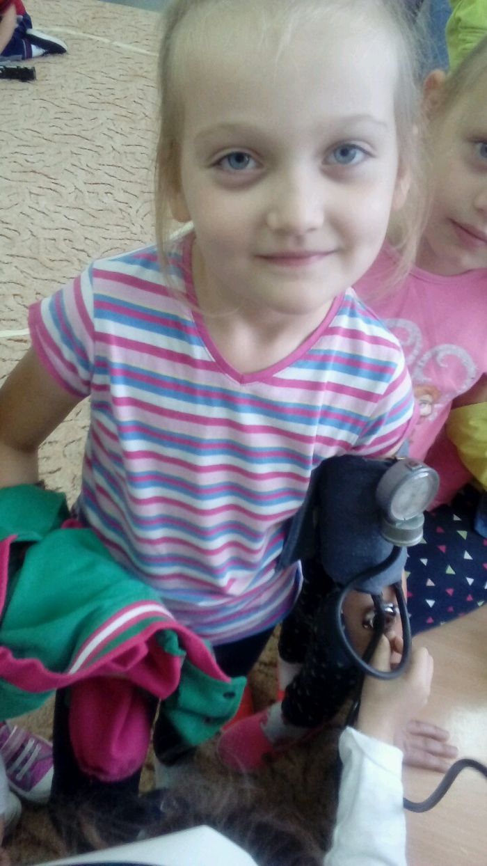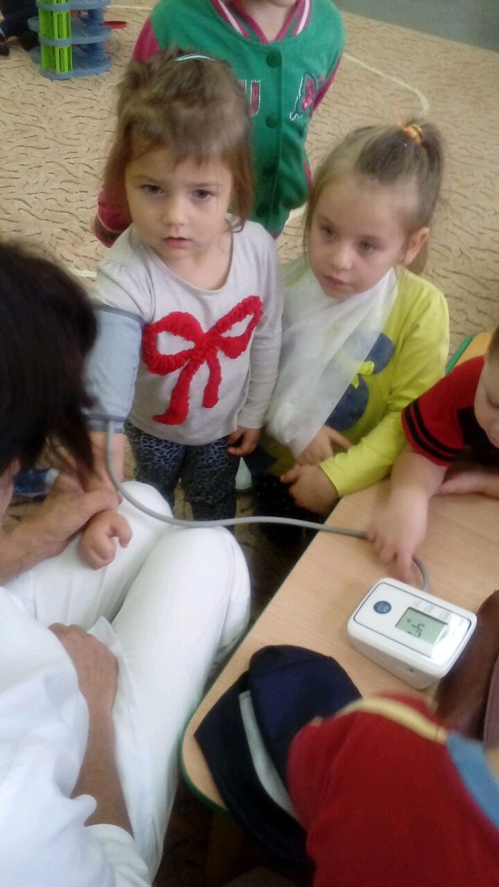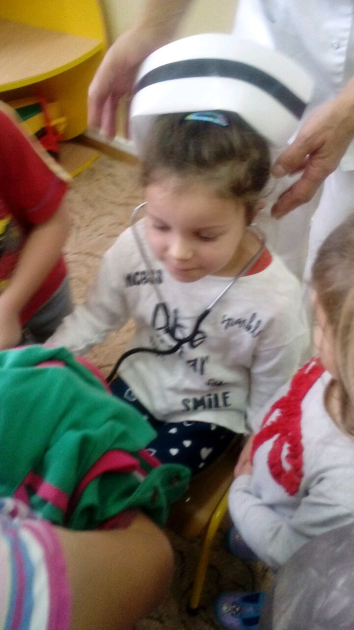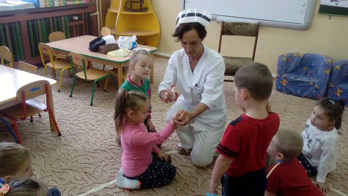 Tego dnia pani Stasia przyszła do przedszkola w białym fartuchu, a na głowie miała czepek pielęgniarski. Pani pielęgniarka przygotowała dla nas pogadankę na temat potrzeby dbania o zdrowie i opowiedziała na czym polega jej praca. W czasie spotkania dzieci dowiedziały się w jaki sposób zachowywać się podczas choroby oraz konieczności zażywania lekarstw tylko pod okiem dorosłych. Przedszkolaki dowiedziały się również jak należy o siebie dbać, właściwie się odżywiać, stosownie ubierać się do pogody. Pani Stasia opowiedziała też o swojej pracy i przyniosła ze sobą różne akcesoria takie jak: bandaże, ciśnieniomierz, nowoczesny termometr do pomiaru temperatury ciała, maści, tabletki i różne rodzaje strzykawek. Dzieci miały możliwość zmierzenia sobie temperatury, ciśnienia, a także oglądały różne kolorowe tabletki. Uczyły się robić opatrunek przy skaleczeniu, a także bandażowały nogę.