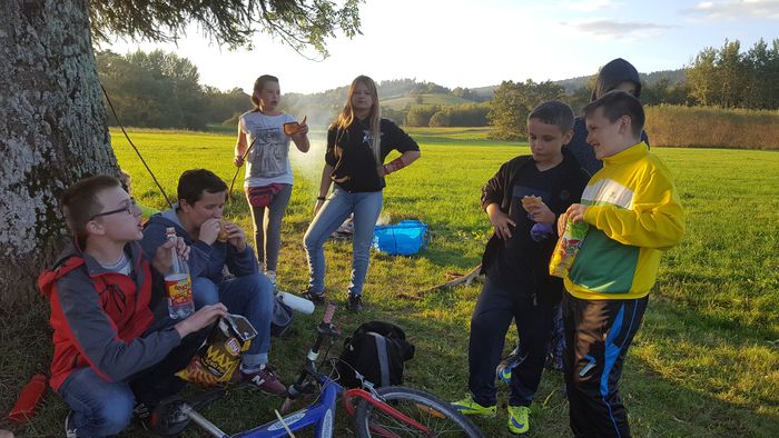 W nagrodę za wspaniałą pracę, rozpalone zostało ognisko i nasi podopieczni mogli odpocząć, delektując się zapachem i smakiem pieczonych kiełbasek. Po zjedzeniu wszystkich smakołyków przyszedł czas na zabawę w podchody i ciuciubabkę. Jako, że 25 września to już polska złota jesień, około godziny 19 mogliśmy oglądać piękny zachód słońca nad Słonnem. W związku z tym, że zaczęło się ściemniać zabawy musiały dobiec końca. Wszystkie materiały zużyte do prac przy pomniku zostały posprzątane i dzieci mogły bezpiecznie wrócić do swoich domów. Zarówno praca jak i zabawy oraz ognisko zostały uwiecznione na pięknych zdjęciach.