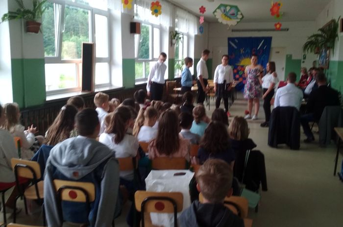 Dnia 22 czerwca odbyło się w naszej szkole zakończenie roku szkolnego 2017/2018. Uroczystość rozpoczęła się Mszą Św., następnie uczniowie, nauczyciele i rodzice przybyli do szkoły. Pani dyrektor Lucyna Matuszewska wszystkich serdecznie powitała, wprowadzono poczet sztandarowy i odśpiewano hymn szkolny.