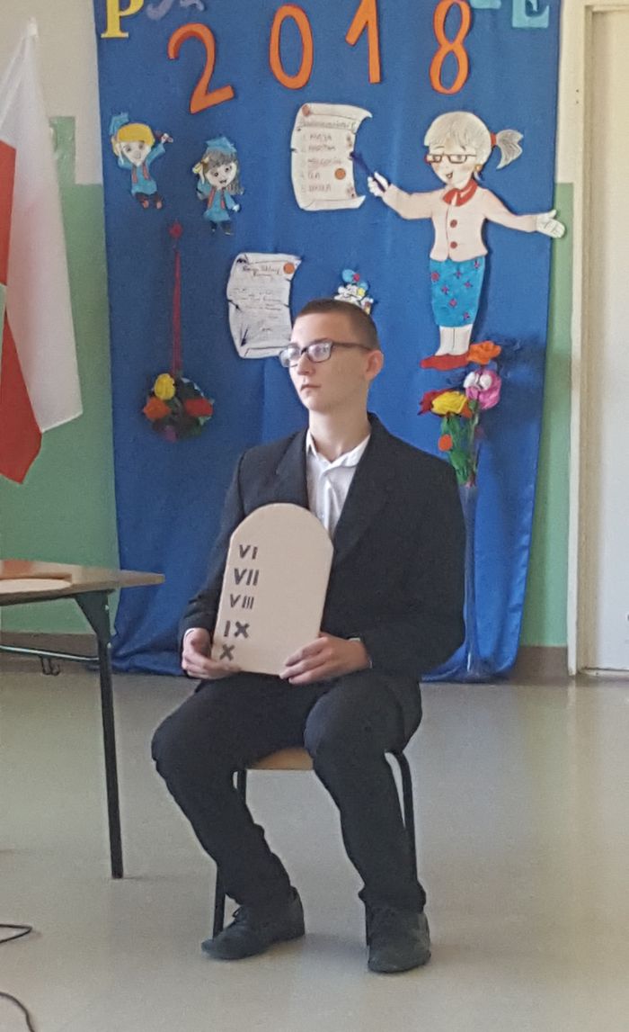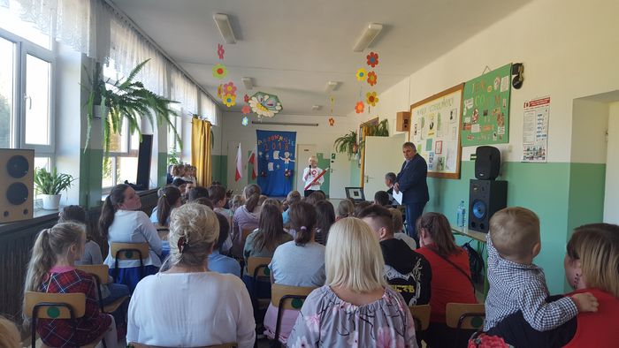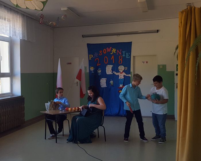 Jako, że Dzień Edukacji Narodowej przypadł w tym roku na niedzielę, w naszej szkole uroczysty apel z tej okazji odbył się 12 października. Przedstawienie pod przewrotnym tytułem „Obyś cudze dzieci uczył”, przygotowali uczniowie klas III-VIII pod przewodnictwem Pani Bożeny Plezi. Inscenizacja składała się z kilku aktów, a po każdym z nich była zasłaniana kurtyna, tak, aby nasi młodzi aktorzy mogli przygotować się do kolejnego wejścia, co dodatkowo potęgowało ciekawość publiczności. Po zakończonym przedstawieniu każdemu nauczycielowi uczniowie wręczyli piękne, własnoręcznie przygotowane Słoiki Pozytywnych Myśli. Nie zapomniano również o byłych nauczycielach naszej szkoły. Dla nich również zostały przygotowane wspaniałe kartki z życzeniami, które uczniowie doręczyli każdemu osobiście.