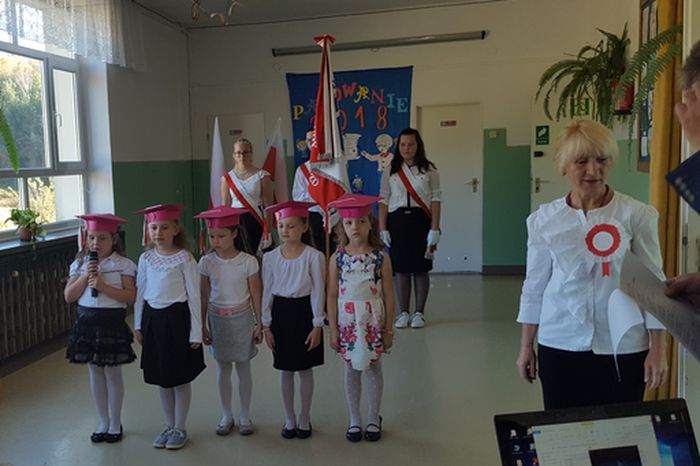 12 października pierwszoklasistki naszej szkoły zostały pełnoprawnymi uczennicami. Był to wyjątkowy dzień, zarówno dla samych uczennic jak i ich rodziców, wychowawcy i Pani Dyrektor. Uroczystość prowadził Pan Janusz Kurcoń, a dzieci z klasy I przygotowały krótkie przedstawienie dla swoich starszych koleżanek i kolegów. Zgodnie z tradycją, pierwszoklasiści musieli wykazać się swoją wiedzą i umiejętnościami. Wspólnie śpiewały piosenki i recytowały wiersze. Po ślubowaniu pani dyrektor Lucyna Matuszewska pasowała dzieci klas pierwszych na uczniów Szkoły Podstawowej Fundacji „Elementarz” im. Szybowników Polskich w Bezmiechowej Dolnej. Na zakończenie wszystkie uczennice otrzymały pamiątkowe dyplomy i birety. I klasa zrobiła sobie pamiątkowe zdjęcie ze swoim wychowawcą i po zobaczeniu kolejnego przedstawienia – tym razem z okazji Dnia Edukacji Narodowej, w radosnym nastroju udała się do swoich sal na słodki poczęstunek przygotowany przez rodziców.