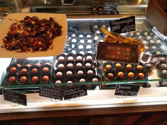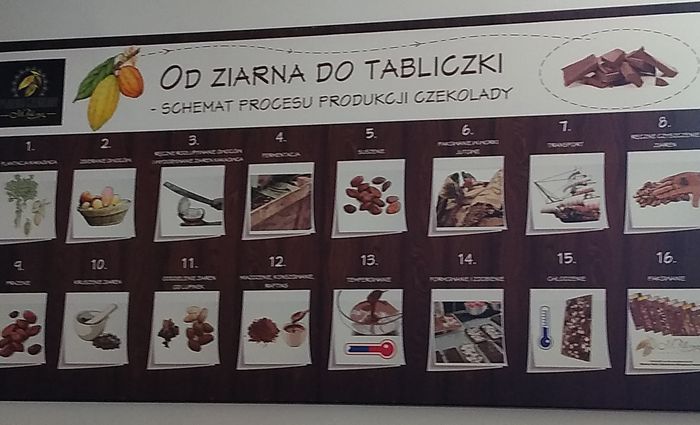 Kiedy dotarliśmy do Fabryki Pani kierowniczka oprowadzała nas po pomieszczeniach, gdzie znajdowały się smakowite, przeróżne wyroby czekoladowe oraz urządzenia do produkcji czekolady np. piec do prażenia ziaren kakao, wyciskarka do masła kakaowego. Nasze spotkanie z czekoladą zaczęliśmy od jej degustacji. Były to: czekolada biała, mleczna, gorzka. Wszystkie wyglądały wyjątkowo i smakowały przepysznie. Jednak dowiedzieliśmy się od Pani, że najzdrowszą czekoladą jest „gorzka”, która zawiera najwięcej magnezu. Można ją spożywać np. w czasie nauki. Pani doradziła nam, abyśmy jak najmniej jedli białą czekoladę, gdyż nie zawiera ani magnezu ani kakao tylko sam tłuszcz.