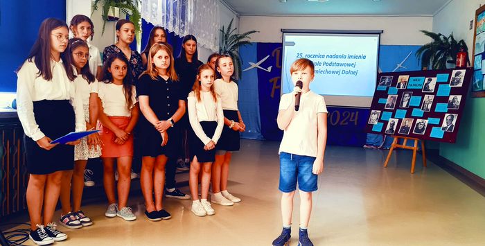 Następnie głos zabrała Dyrektor Szkoły Pani A. Wójcicka, która przypomniała wszystkim zgromadzonym z czym wiąże się posiadanie patrona i jakie niesie ze sobą zobowiązania dla społeczności szkolnej. Kolejna rocznica nadania imienia to wydarzenie, które stało się również wspaniałą okazją do przypomnienia wszystkich postaci związanych z Patronem-Szybownikami Polskimi – w formie tablo oraz przygotowaniem przez Pana P. Króla i Panią A. Wańcę wystawy upamiętniającej najważniejsze wydarzenia z życia szkoły w oparciu o kroniki, artykuły i posiadane pamiątki. W ramach obchodów Pan J. Kurcoń przeprowadził także wśród uczniów szkolny konkurs pt. „Co wiem o Szkole Szybowcowej w Bezmiechowej Dolnej”. Dodatkowo na tę okoliczność Pani M. Drozdalska–Hołub zorganizowała w szkole wystawę prac plastycznych związanych z szybownictwem. W oparciu o prezentację multimedialną przygotowaną przez Panią B. Plezię wysłuchaliśmy również wspomnień z przebiegu wcześniejszych jubileuszy nadania imienia szkole. Uczniowie pod kierunkiem Pana P. Krasulaka zaprezentowali także krótki program artystyczny zakończony odśpiewaniem utworu pt. „Marsz lotników”.