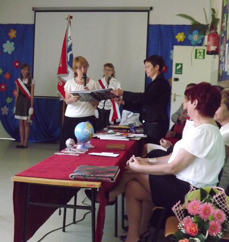Drugim ważnym punktem programu było zakończenie szkoły przez uczniów klasy szóstej. Pani dyrektor wraz z wychowawczynią p. Jolantą Mysza wręczyły absolwentom świadectwa i wyniki sprawdzianu szóstoklasisty, otwierające drogę do gimnazjum. Gratulowały ukończenia szkoły i życzyły wszystkiego najlepszego na nowym etapie życia.