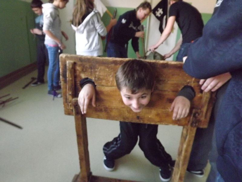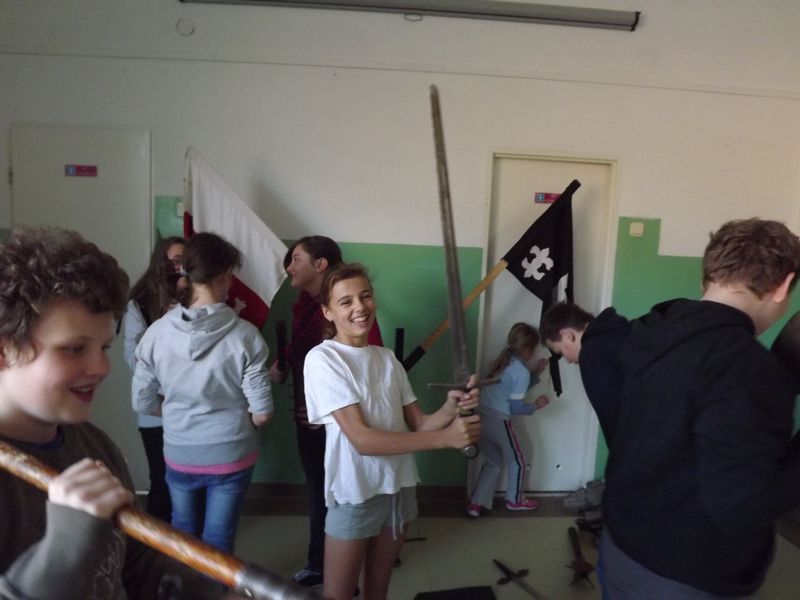 Uczniowie wysłuchali opowieści o zwyczajach rycerskich, życiu w tej epoce. Mogli obejrzeć rycerskie uzbrojenie, zobaczyć  pojedynek a nawet stanąć do walki na miecze. Mogli również poczuć na własnej skórze jak to było z tymi dybami, co czuł nieszczęśnik w nie zakuty. Zgromadzona publiczność żywiołowo reagowała na występ. Taka „podróż do krainy, którą obecnie pokrył już kurz minionych wieków”, okazała się ciekawą lekcją historii.
