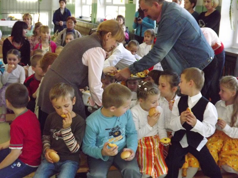 Przedszkolaki recytowały krótkie wierszyki o tematyce dożynkowej. Starościna i Starosta częstowali wszystkich dookoła chrupiącymi bułeczkami z dorodnej pszenicy, których fundatorem była Pani Monika Mikołajczak.