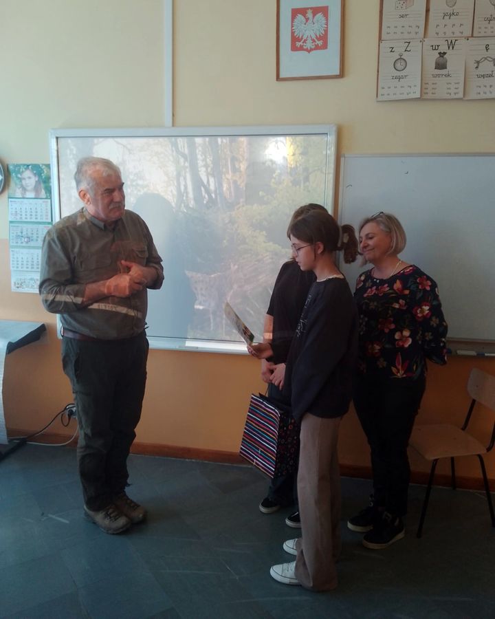 Spotkanie z nim było prawdziwą lekcją o przyrodzie i miłości do natury. Nasz gość opowiadał z ogromną pasją o swoich przygodach w lesie, o zwierzętach i roślinach, które spotyka na co dzień, a także o tym, jak ważne jest dbanie o środowisko naturalne.