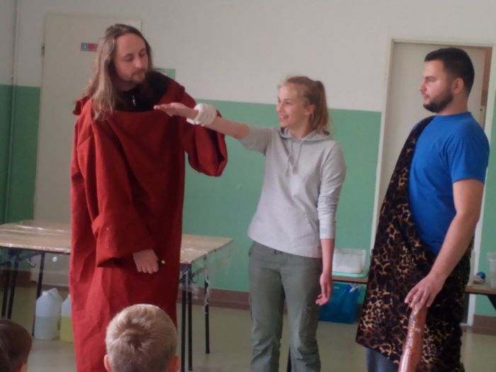Następnie Samorząd Szkolny pod kierunkiem p. Anny Wnęk i uczniowie klas IV – VI, chcąc uczcić Dzień Edukacji Narodowej, zaprezentowali swój program artystyczny. W sposób humorystyczny w formie skeczy przedstawili dzień z życia szkoły. Była lekcja, odpowiedzi uczniów, przerwy oraz zmagania nauczycieli. Na koniec dzieci złożyły nauczycielom życzenia i obdarowały własnoręcznie przygotowanymi upominkami.