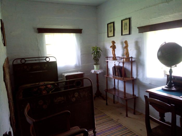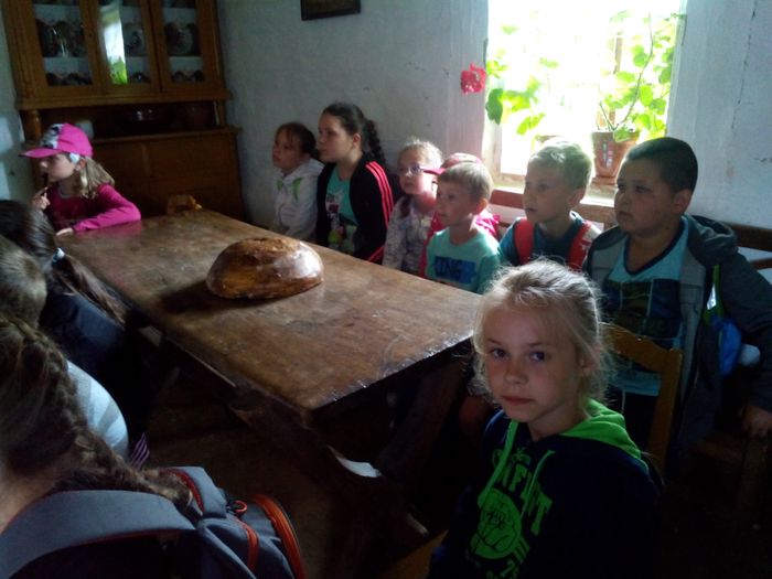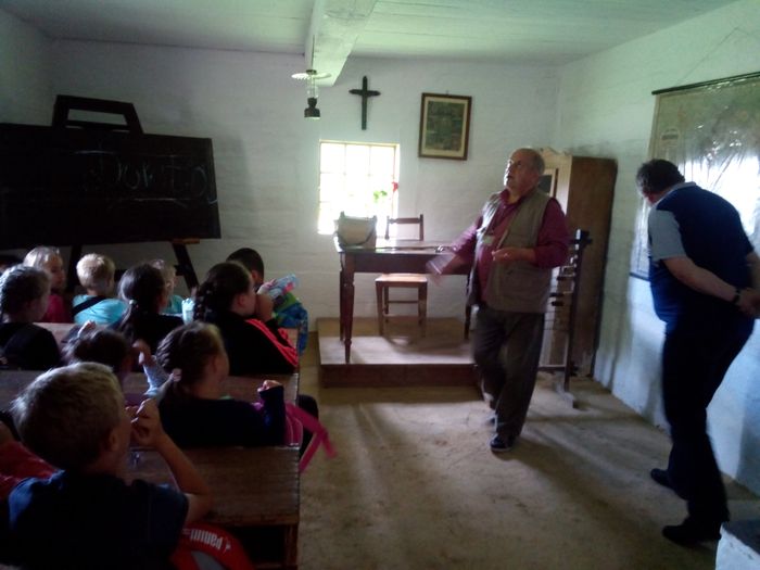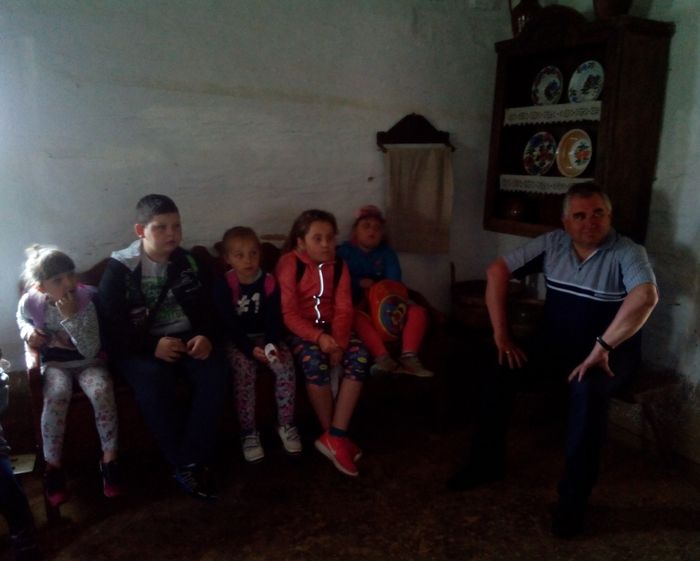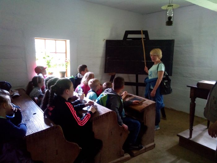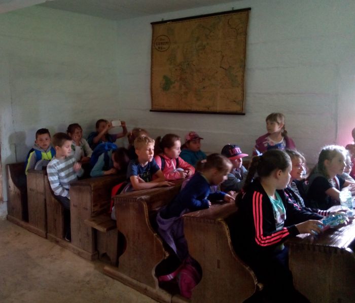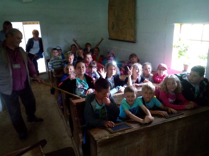 Szczególne zainteresowanie wzbudziła chata, w której mieściła się szkoła wiejska. Obejrzeliśmy ciekawe eksponaty – stare podręczniki, przybory szkolne, plansze edukacyjne. Każdy z nas miał okazję usiąść w drewnianych ławkach i dotknąć tabliczek, na których pisano za pomocą rysików.