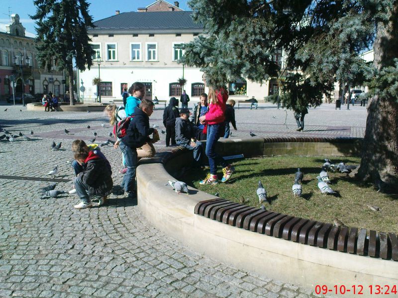 Kolejnym miejscem, które odwiedziliśmy było Krosno. Tam mieliśmy okazję pozwiedzać miasto jeżdżąc kolejką turystyczną, a na Rynku, w trakcie chwilowego odpoczynku, mogliśmy pokarmić gołębie, które jadły nam z rąk. Następnie udaliśmy się do Centrum Dziedzictwa Szkła. Tam poznaliśmy techniki obróbki szkła oraz tworzenia różnych ciekawych rzeczy z materiału jakim jest szkło. W ramach zajęć zdobiliśmy szklanki, które po zakończeniu pracy mogliśmy wziąć ze sobą. Ponadto dowiedzieliśmy się jak powstają witraże, jak maluje się bombki choinkowe oraz czym zajmuje się grawer.