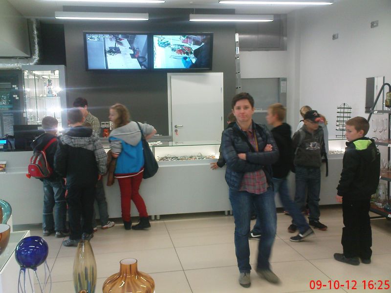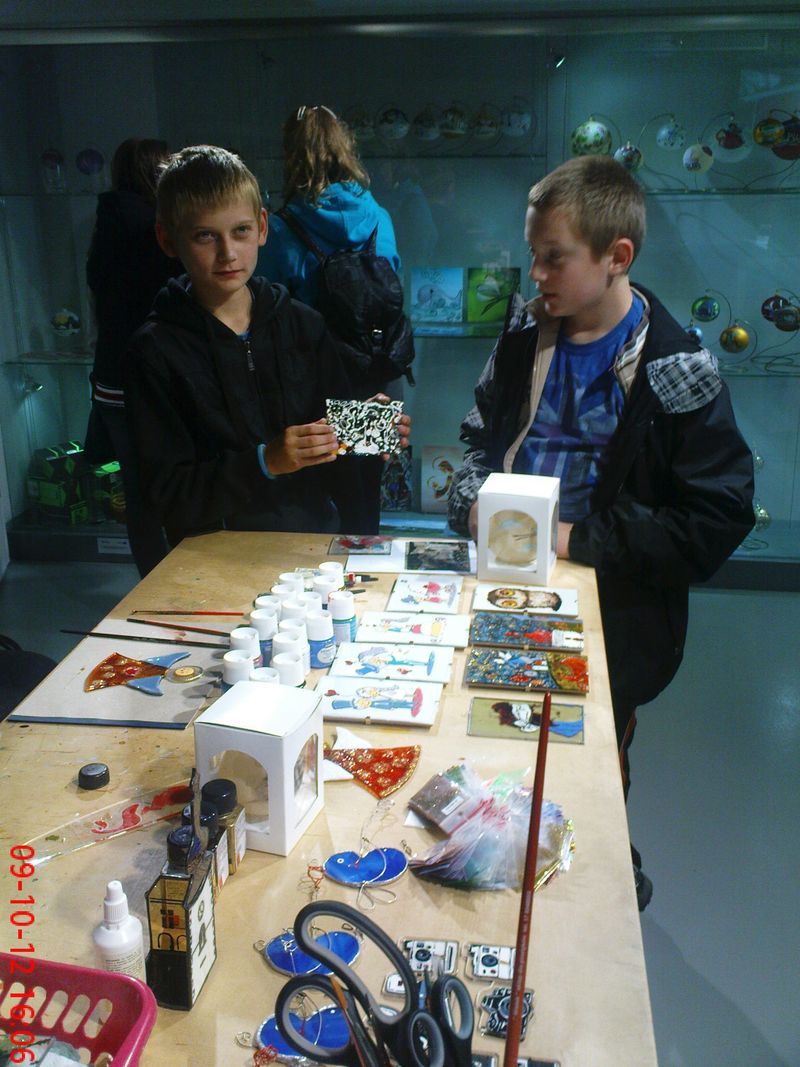 Kolejnym miejscem, które odwiedziliśmy było Krosno. Tam mieliśmy okazję pozwiedzać miasto jeżdżąc kolejką turystyczną, a na Rynku, w trakcie chwilowego odpoczynku, mogliśmy pokarmić gołębie, które jadły nam z rąk. Następnie udaliśmy się do Centrum Dziedzictwa Szkła. Tam poznaliśmy techniki obróbki szkła oraz tworzenia różnych ciekawych rzeczy z materiału jakim jest szkło. W ramach zajęć zdobiliśmy szklanki, które po zakończeniu pracy mogliśmy wziąć ze sobą. Ponadto dowiedzieliśmy się jak powstają witraże, jak maluje się bombki choinkowe oraz czym zajmuje się grawer.